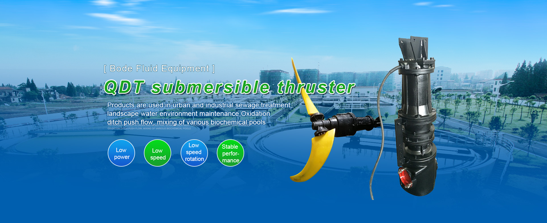 It is a technical enterprise that specializes in designing, developing, manufacturing and selling environmental protection equipment and various water pump products. Professional R&D and productionSubmersible mixer, submersible thruster, submersible aeratoretc. It is widely used in the treatment of urban and industrial sewage, the maintenance of landscape water environment, etc. The products are sold in various provinces, cities and autonomous regions across the country, and are deeply trusted and praised by users. QDT type submersible thrusters and submersible aerators are widely used in oxidation ditch thrusting and mixing of various biochemical pools in the water treatment process, and can also be used for river antifreeze;